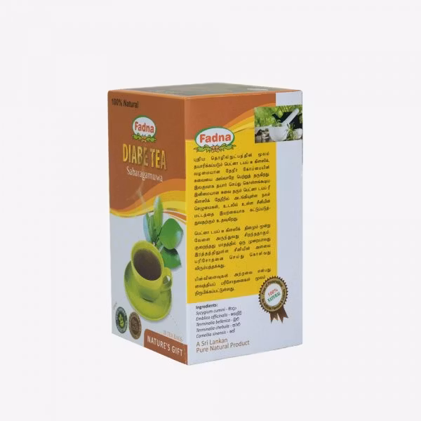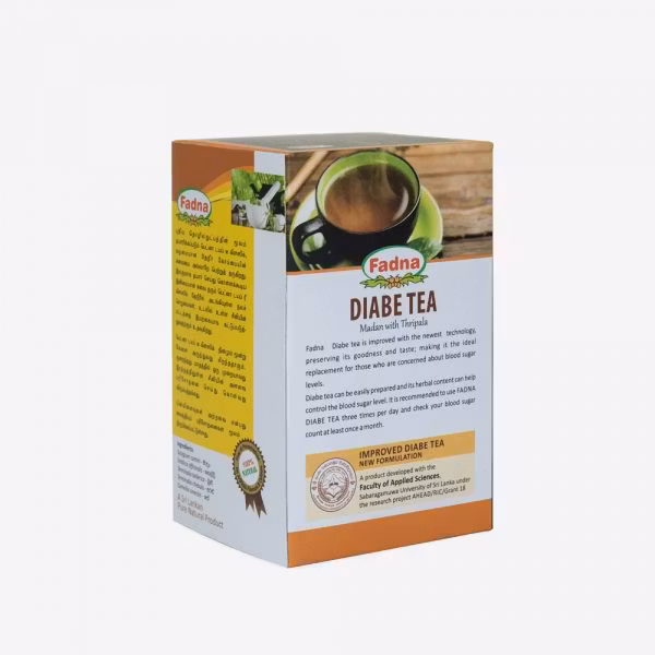 Fadna Diabe Tea är speciellt formulerat för att kontrollera sockerrelaterade störningar och därigenom minska risken för komplikationer relaterade till dessa. Detta te är berikat med svart te, som är rikt på flavonoider och fungerar som en kraftfull antioxidant som reglerar hastigheten av glukostillförsel till blodet. Forskning har utförts av avdelningen för biokemi vid Medicinska fakulteten, University of Jayawardenapura, om Diabe Teas hypoglykemiska och toxicitetseffekter på människor, och det har bevisats vara säkert för daglig konsumtion.