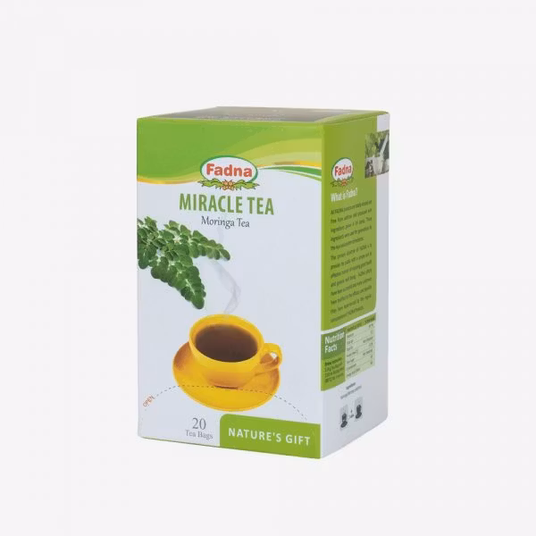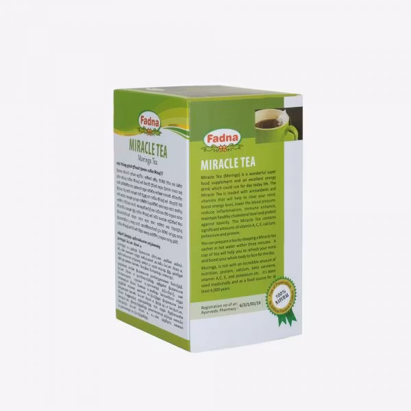 Miracle-te består av den rika och näringsfulla örten Moringa, som är full av ett enormt antal vitaminer och mineraler. Detta te är ett idealiskt naturligt kosttillskott för dem som söker en naturlig lösning för att återställa sina förlorade näringsbehov. Denna smakfulla kopp te kan också användas för att kontrollera anemiska tillstånd, andningssvårigheter och förbättra hudens utseende.