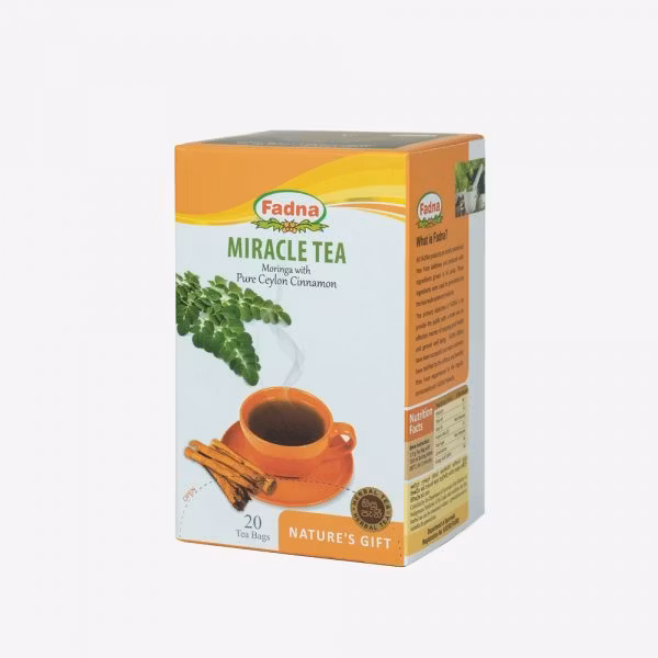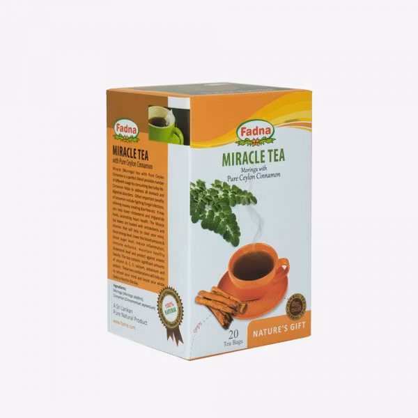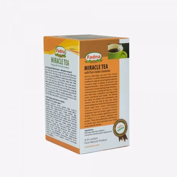 Miracle-te med Moringa och Kanel är en mirakulös kombination som har den gemensamma egenskapen att förbättra mental hälsa, samtidigt som den stärker minnesförmågan och kontrollerar humörsvängningar. Moringa och Kanel är också en utmärkt kombination för att hjälpa till att kontrollera sockerrelaterade störningar och reparera skadade celler, samtidigt som den främjar en hälsosam kardiovaskulär funktion. Att konsumera detta 100 % naturliga te dagligen hjälper till att omdefiniera skönhet.