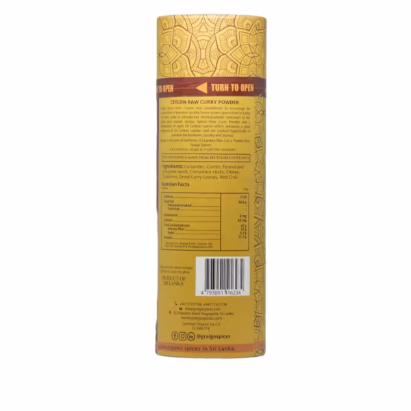 Njut av den autentiska smaken av det lankesiska köket med Gralgo Spices Orostade Curry Pulver, en mästerlig blandning av åtta förstklassiga lankesiska kryddor. Denna unika kombination förhöjer din matlagningsupplevelse och passar perfekt för curryrätter, med smaker som överträffar vanliga kryddblandningar. Inspirerad av traditionella recept som gått i arv genom generationer är vårt curry pulver hygieniskt förpackat för att bevara fräschheten, kvaliteten och aromerna som är avgörande för genuin lankesisk matlagning.
