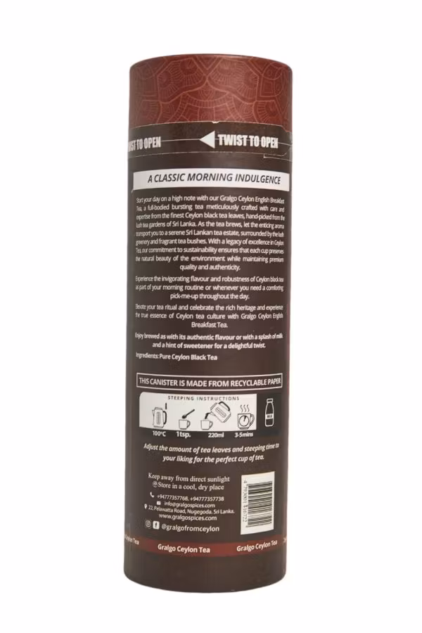 Gralgo Ceylon English Breakfast Te, ett fylligt och smakrikt te, noggrant framställt med omsorg och expertis från de finaste Ceylon-svarta tebladen. Upplev den uppfriskande smaken och kraften hos Ceylon-svart te.
