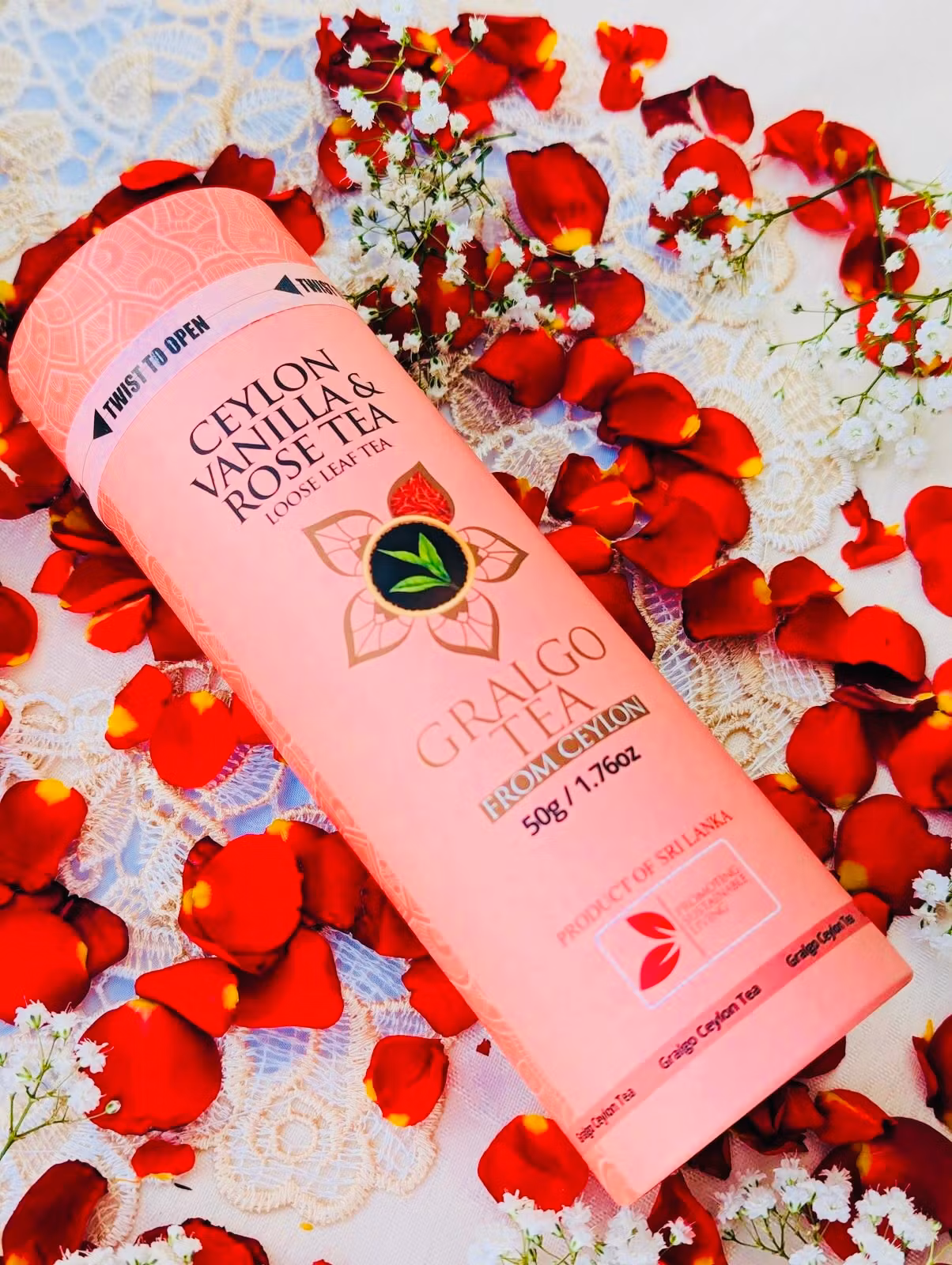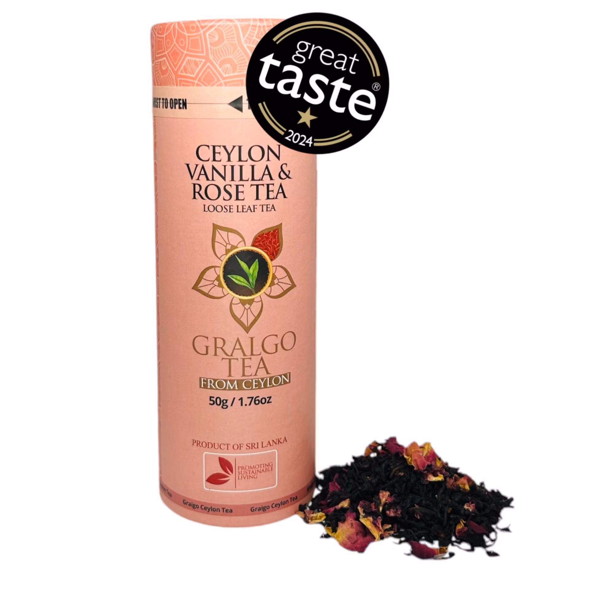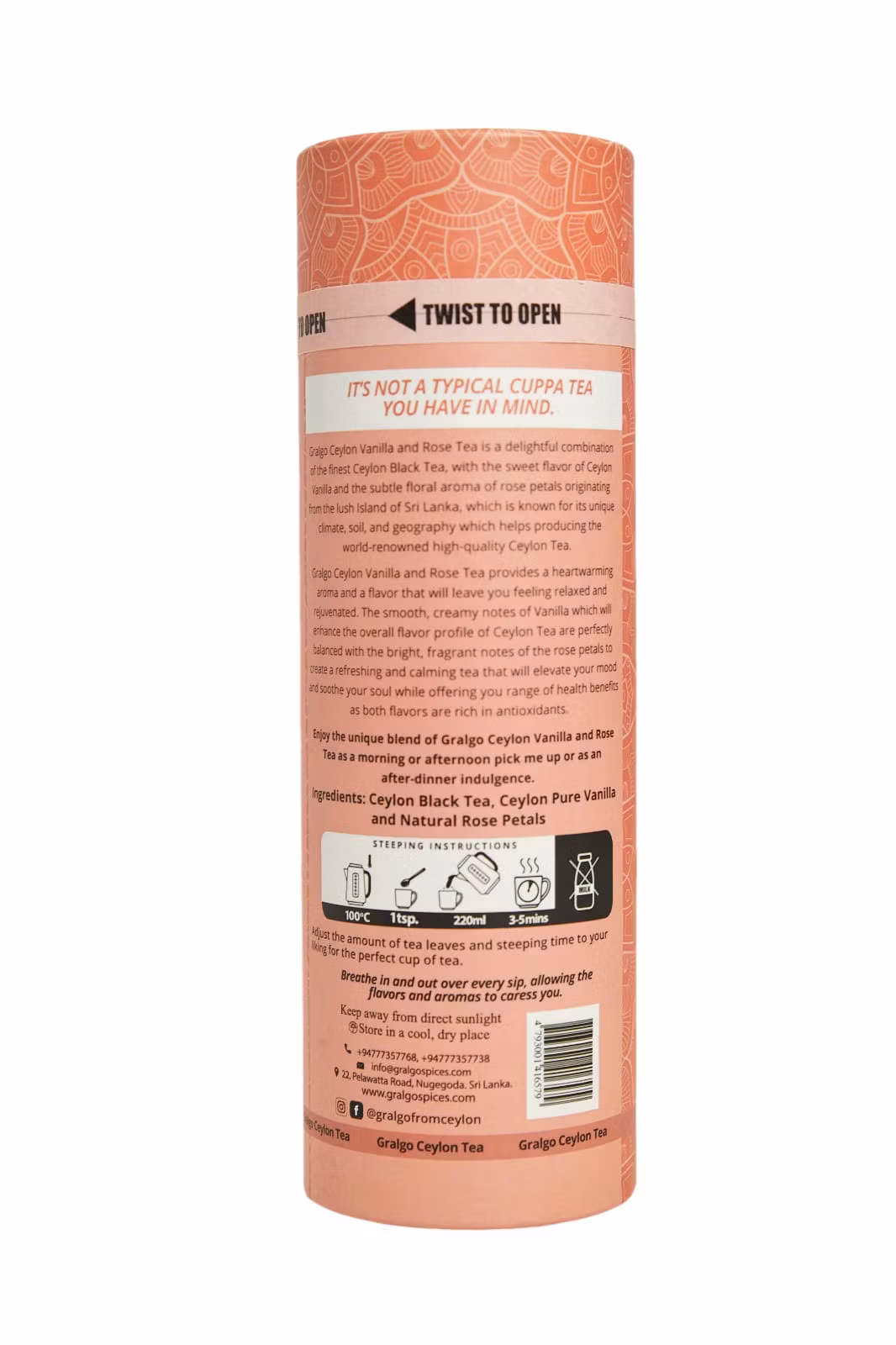Gralgo Ceylon Vanilla och Rose Tea är en utsökt kombination av det finaste Ceylon-svarta teet, smaksatt med den söta smaken av Ceylon-vanilj och den subtila blommiga aromen av rosenblad, hämtade från Sri Lankas frodiga ö. De mjuka, krämiga tonerna av vanilj förhöjer den övergripande smakprofilen hos Ceylon-teet och balanseras perfekt med de ljusa, doftande noterna från rosenbladen. Resultatet är en uppfriskande och lugnande teupplevelse som lyfter humöret och skänker ro till själen. Detta te är rikt på antioxidanter och erbjuder en rad hälsofördelar. Gralgo Ceylon Vanilla och Rose Tea är en härlig blandning av det finaste Ceylon-svarta teet, smaksatt med den söta smaken av Ceylon-vanilj och den subtila blommiga aromen av rosenblad. Hämtat från Sri Lankas frodiga ö, känd för sitt unika klimat, sin bördiga jord och geografi, är detta te framställt med högsta kvalitet och erbjuder dig det världsberömda Ceylon-teet.